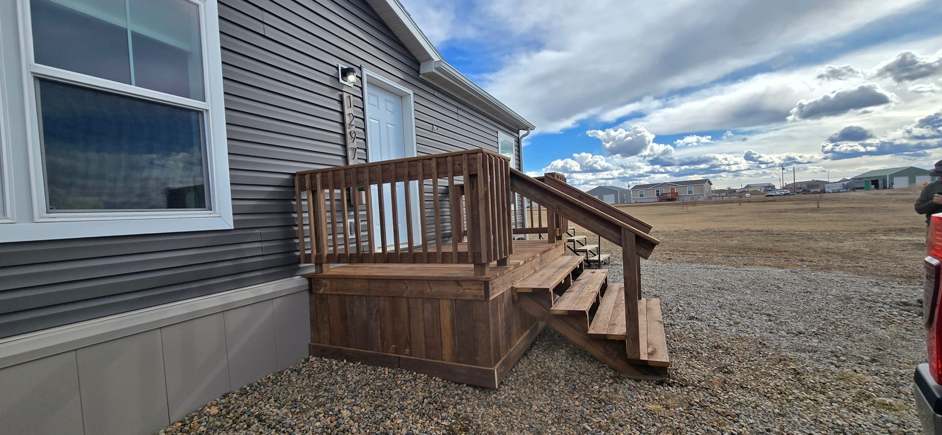 Level Up Portable Decks uses pressure-treated materials and offers finishing options including composite decking and aluminum railing. Every deck is designed for long-term outdoor performance without the disruption that comes with traditional on-site construction. We serve customers throughout Montana, North Dakota, South Dakota, and Wyoming, with free delivery within 35 miles of our locations in Circle, Sidney, Glendive, and Miles City.